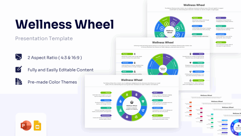 Download this Wellness Wheel Template to clearly present the concepts of holistic health and life balance. Whether you are leading a corporate wellness workshop, a school health seminar, or a personal coaching session, this circular diagram template helps your audience understand how different life areas connect and influence each other. The design focuses on clarity and ease of use, allowing you to explain complex well-being concepts simply and effectively without overwhelming your viewers.