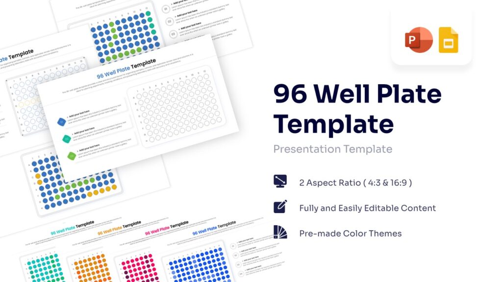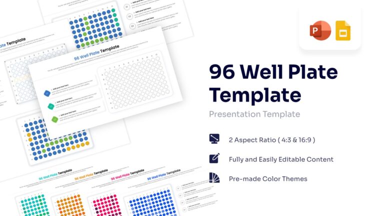 This 96 Well Plate Presentation Template provides a clean, fully editable microplate diagram with clearly labeled rows (A-H) and columns (1-12). You can easily change the color of individual wells to represent different samples, controls, dilutions, or experimental conditions. The design is simple and spacious, ensuring that your audience can read the layout quickly, whether you are showing a pipetting plan or the results of a screening assay.