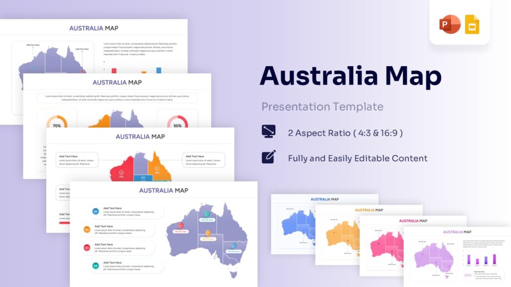 Download this Australia Map Presentation Template and use case for business reports, regional sales analysis, or educational geography lessons. This country map allows you to visualize data across the Australian continent with professional clarity. Whether you are pinpointing office locations or sharing demographic statistics, these maps help you deliver your message without the stress of manual drawing. The clean, modern design ensures your audience stays focused on your data while you present with total confidence.