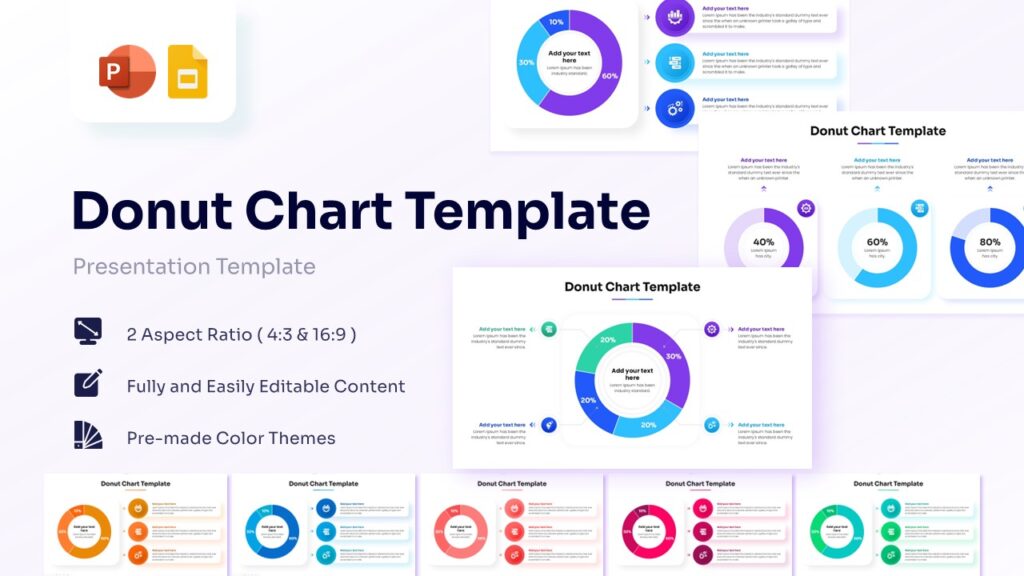 This Donut Chart is designed with flexibility in mind, featuring various layouts like a single large chart with side descriptions or multiple mini-charts for comparing different data points side-by-side. The template uses a professional color palette to distinguish segments clearly, ensuring that your stakeholders can follow your logic without getting lost in the numbers. It is a reliable choice for anyone who needs to deliver a polished report quickly.