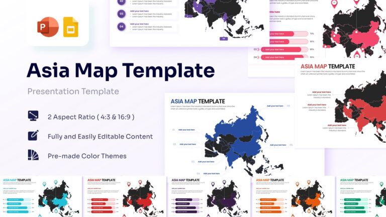 Download this Map of Asia Template to present regional data, market presence, or geographic insights with clarity and professional style. This map template toolkit is perfect for visualizing business expansion, supply chain routes, or demographic statistics across the Asian continent. Whether you are highlighting specific countries like India and China or mapping out a multi-national strategy, these slides provide a polished foundation that helps your audience grasp complex location-based information instantly.