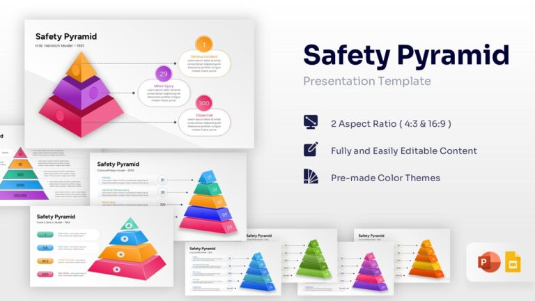 You can use this Safety Pyramid Template in a variety of professional settings, from monthly safety committee meetings and OSHA compliance workshops to new employee orientations. The layout is optimized to hold complex data without looking cluttered, allowing you to present “Close Call” statistics alongside “Serious Incident” reports. Simply pick the model that fits your organization’s reporting style and plug in your specific data to create a polished, expert-level deck in minutes.