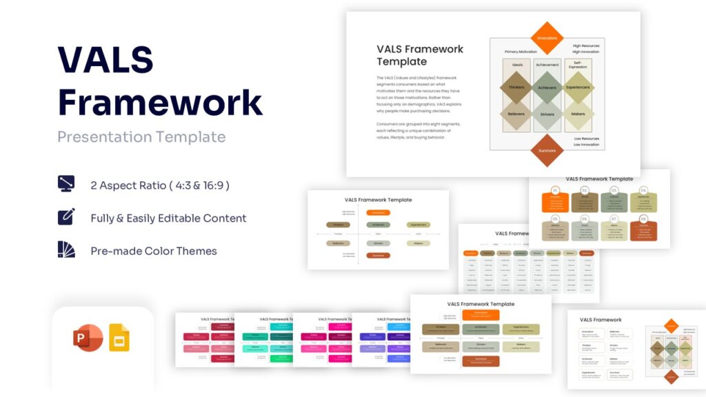 This VALS framework presentation template features a comprehensive set of slides designed to showcase the eight distinct segments of the VALS (Values and Lifestyles) system. It includes the classic diamond hierarchy diagram, detailed matrix layouts, and columnar lists that define Innovators, Thinkers, Believers, Achievers, Strivers, Experiencers, Makers, and Survivors. The design uses a professional, earthy color palette—including orange, olive, and rust tones—to visually categorize segments based on their primary motivations: Ideals, Achievement, and Self-Expression. The clean layout ensures your audience can easily distinguish between high-resource and low-resource groups without getting lost in the data.
