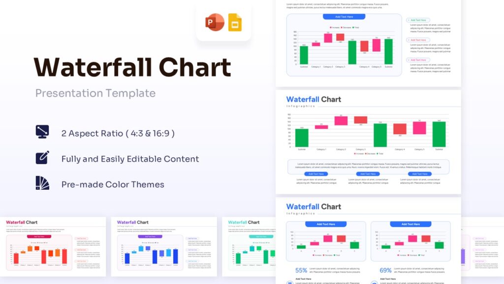 In a professional setting, these Waterfall Chart templates serve as a versatile asset for various departments. Finance teams can use them for year-over-year profit analysis, while HR departments might track headcount fluctuations. Project managers find them invaluable for showing resource allocation or task completion flows. Because the graphics are fully vector-based, you can scale every element without losing quality, making your deck look polished on any screen size, from a laptop to a boardroom projector.