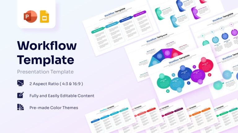 This Workflow Process Template features a variety of layouts including horizontal linear flows, circular process cycles, and detailed phase-based grids. By incorporating a high-quality workflow process diagram, you can communicate your business methodology and operational roadmap more effectively. The design prioritizes readability, using high-contrast icons and color-coded stages to guide the viewer’s eye through the narrative of your professional workflow.